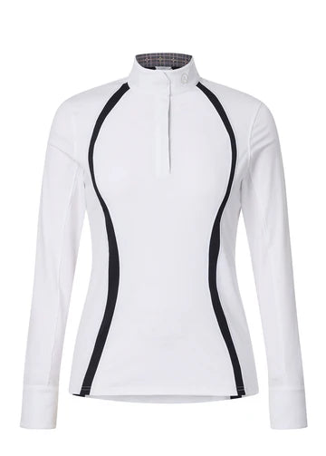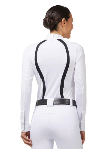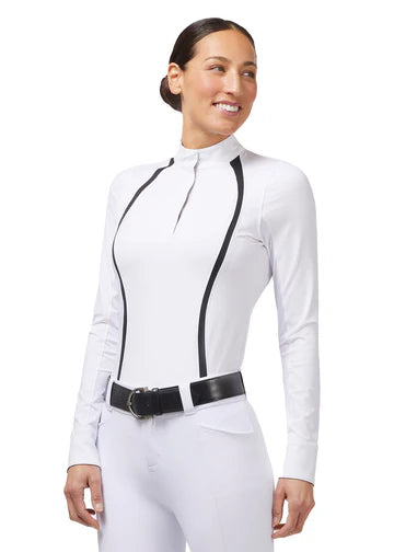 - White front panel and a crisp white collar are paired with contrast color-blocking and feminine seams for a flattering and stylish, show-ready look