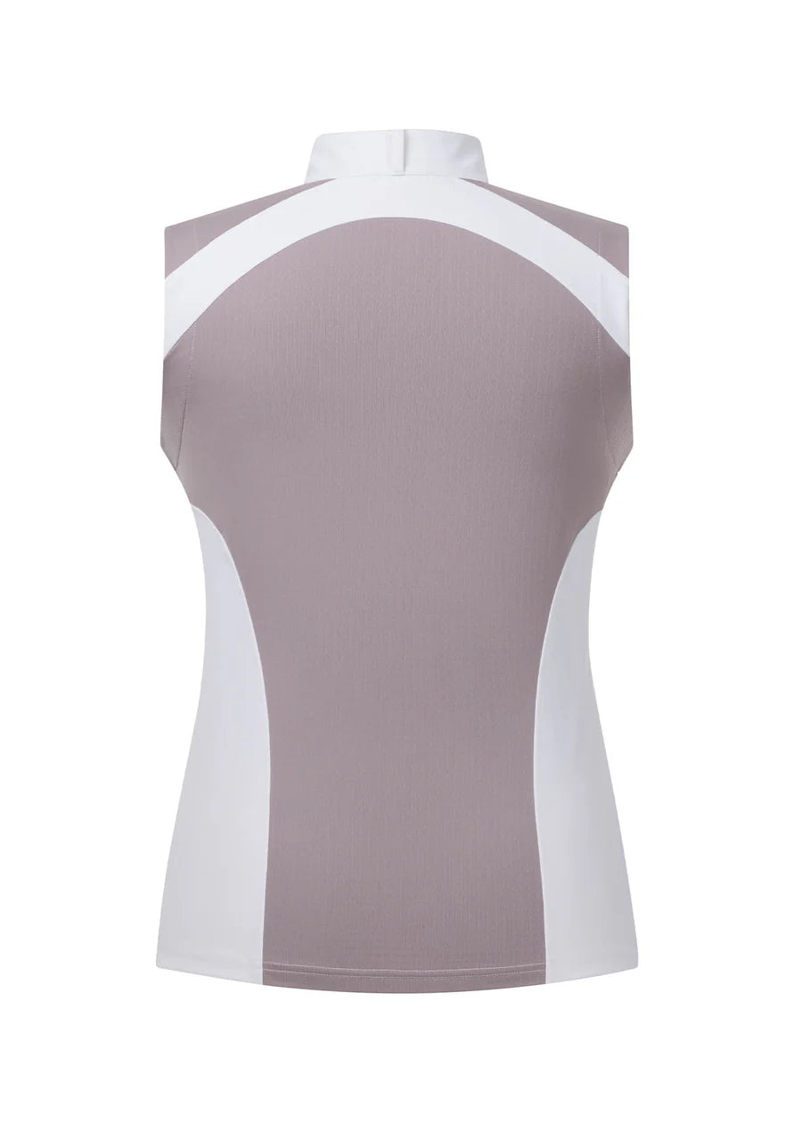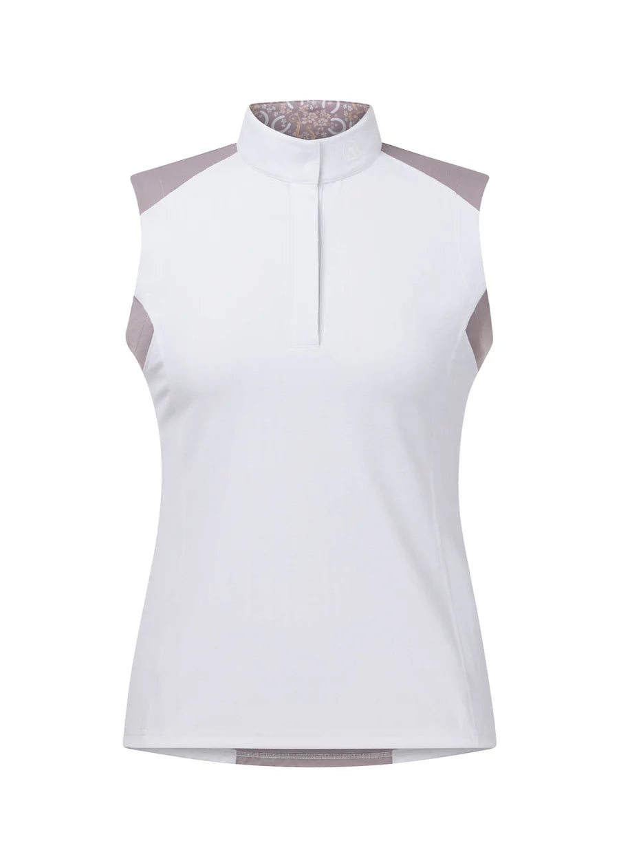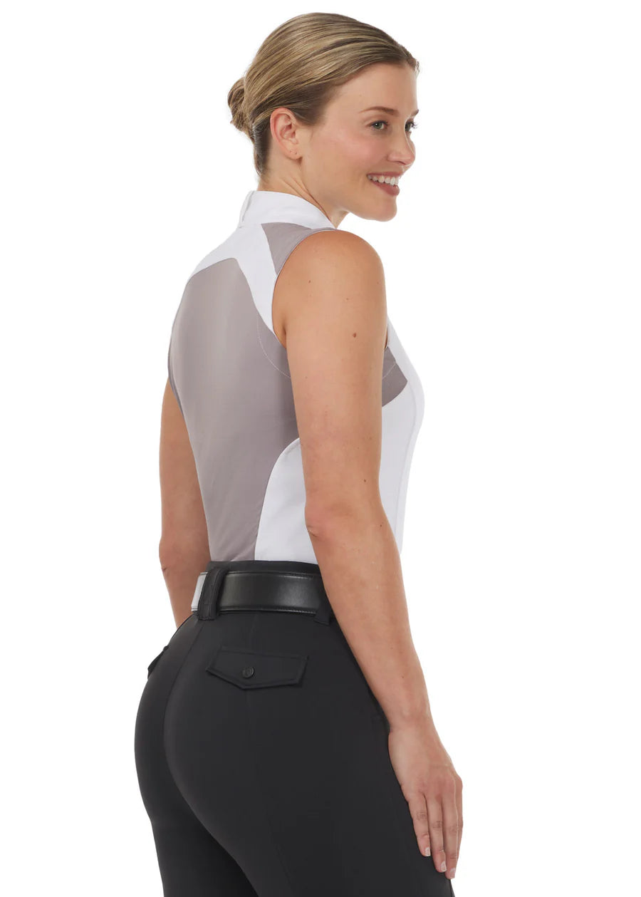 A cooling sleeveless show shirt engineered with a mesh back panel for extra breathability and winning performance when it matters. Shaped seaming and a feminine fit, designed for smooth layering under your show coat. New stretchy, micro-herringbone patterned performance fabric covers, wicks and fights odors keeping you comfy and confident for a personal best round. Equestrian print inside collar adds a pop of color, and so will your ribbons.