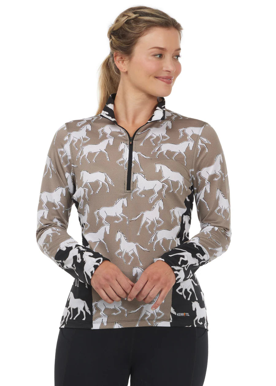 An ultra-light, long sleeve riding top designed in a combo of playful equestrian prints for cool rides in cool style. Kerrits lightest weight fabric uses Ice Fil® technology to help cool skin, wicking and breathing as you trot through summer, keeping you comfy in the saddle. UPF+30 sun protection. Tall collar unzips to boost ventilation.