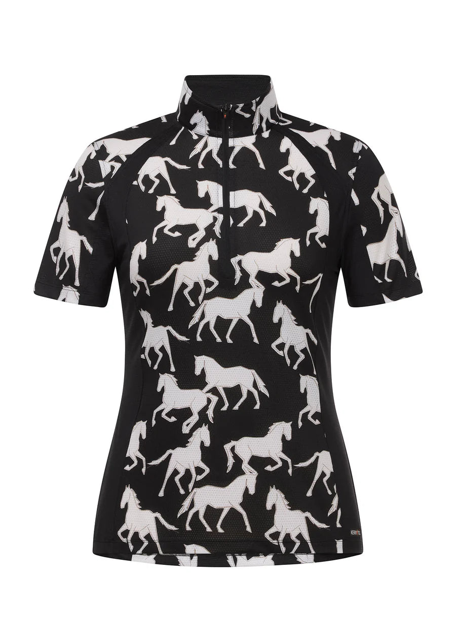 This ultra-light, short sleeve riding top cools and breathes in stunning equestrian prints for a look that catches the eye and the summer breeze. Ice Fil® fabric performs optimally in high heat, wicking and flowing as you trot on with UPF+30 sun protection.