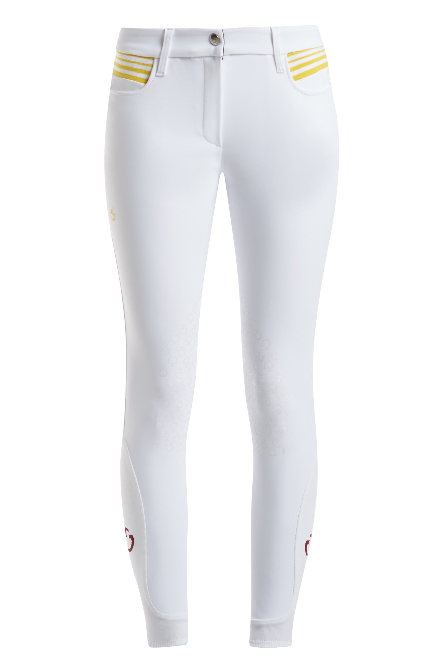 The fashionable essential for training and show breeches, Cavalleria Toscana's Women's Ribbed Insert Breeches are made from technical stretch-jersey, offering both breathability and durability. The ribbed inserts over the pockets add a pop of color making these a one of a kind pair of breeches for the subtle fashionista. Silicone-coated inner knees provide exceptional grip, with stretch-knit sock panels offering superior comfort beneath tall boots.