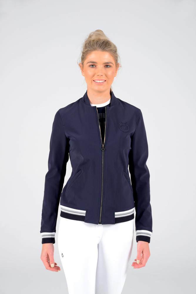 Sleek and elegant bomber jacket with striped detail on cuffs and bottom of jacket. Unlined, ideal as an extra layer in mild weather or over a warmer layer between seasons.