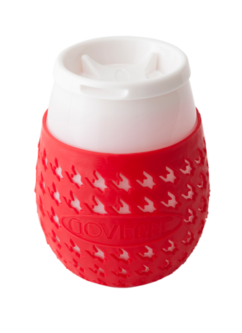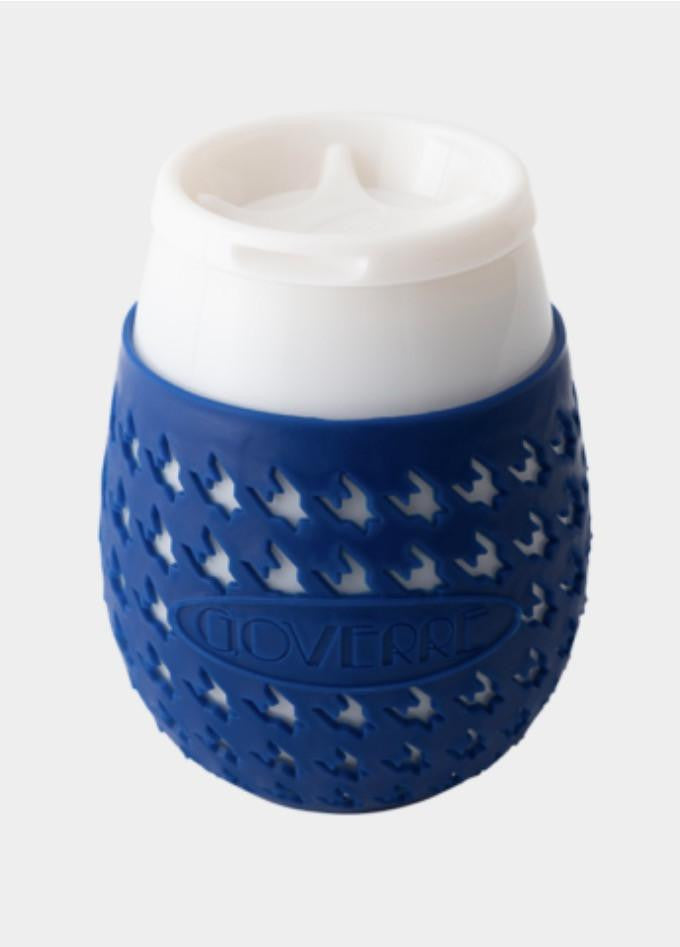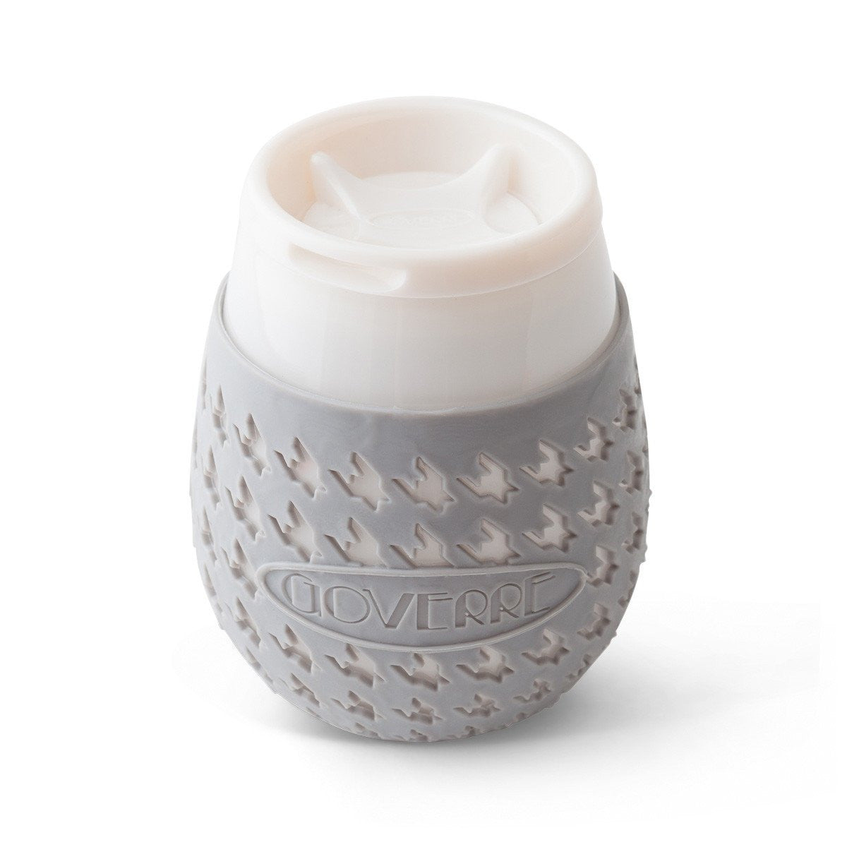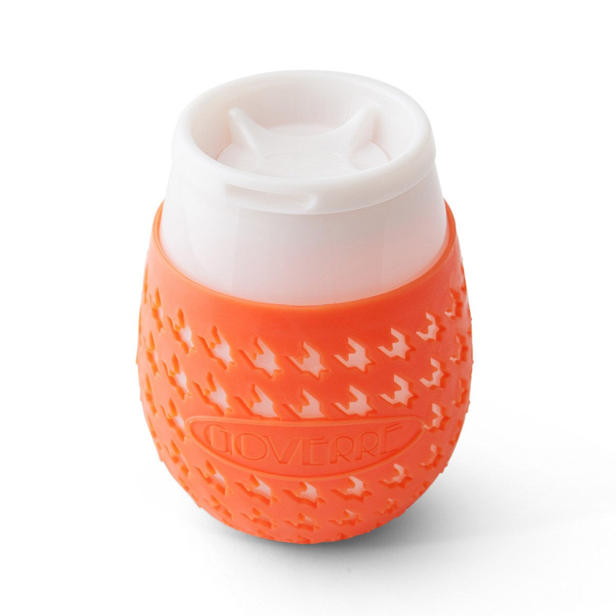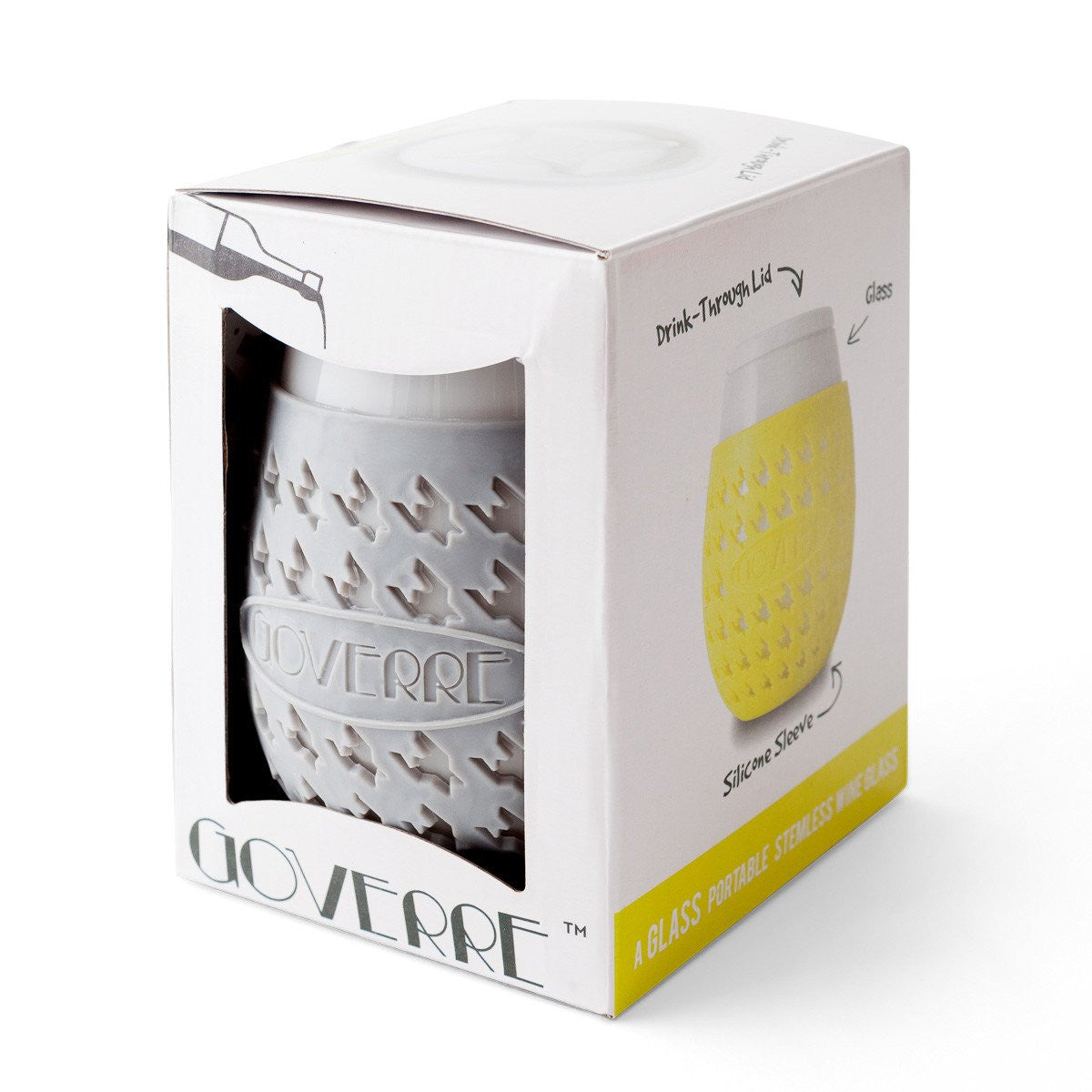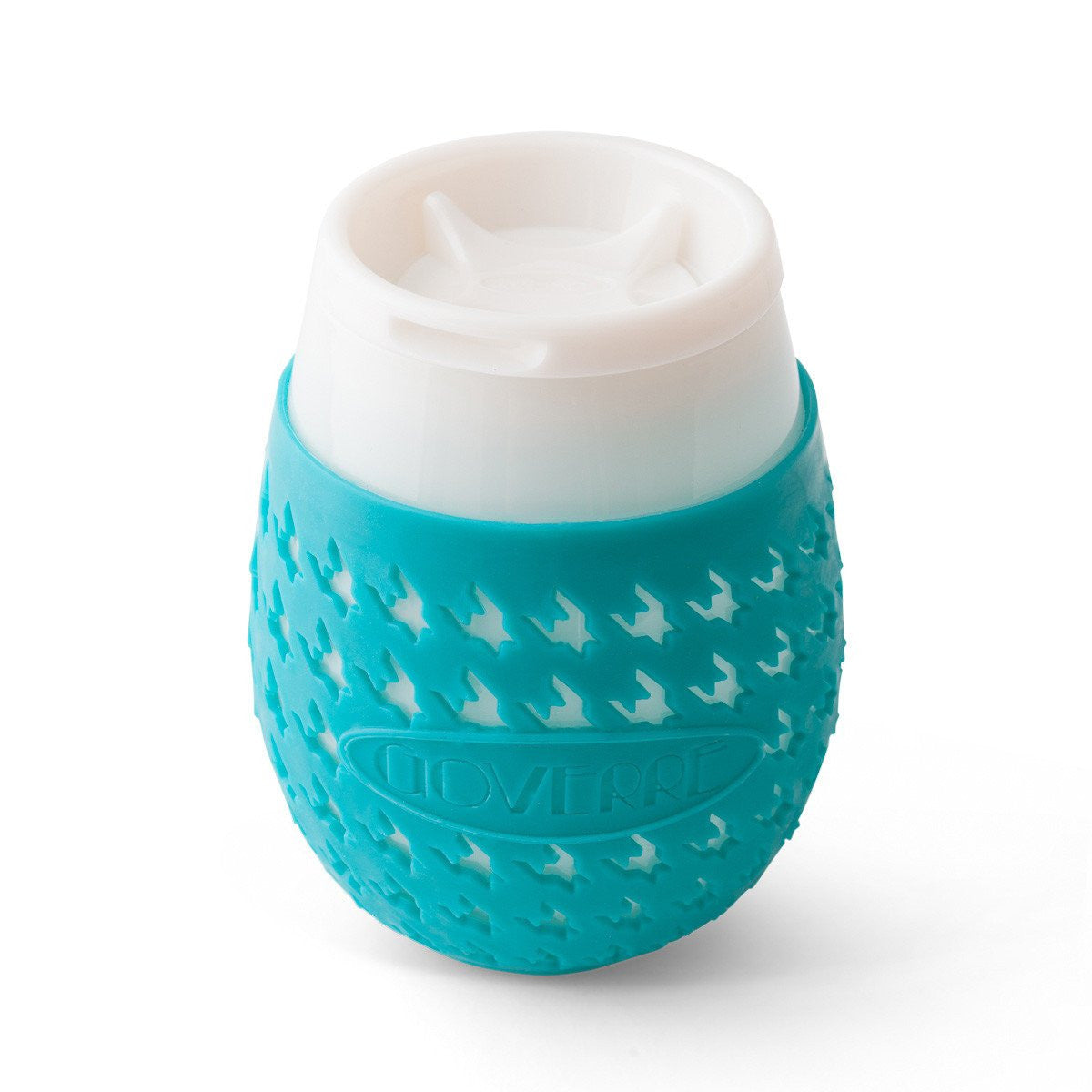 A portable, stemless wine glass with a silicone sleeve and a drink-through lid.