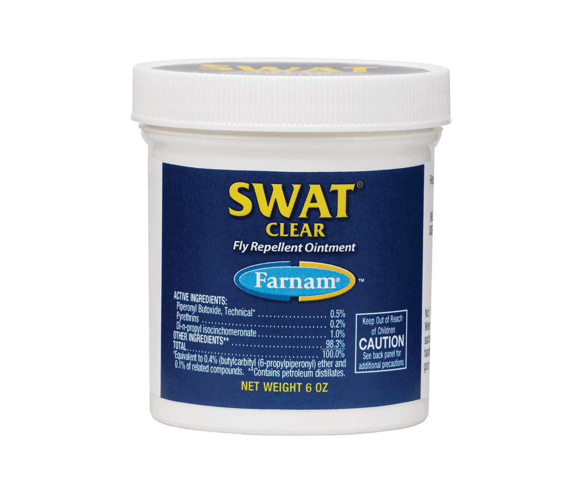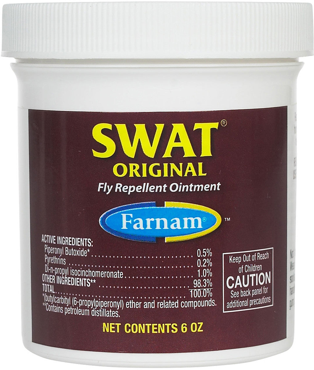 Swat Fly Repellent Ointment is a natural pyrethrin formula repels horse flies, stable flies, face flies, and horn flies on dogs, horses and ponies. Kills them on contact. Ideal for use on facial areas or around open wounds. Should be applied daily for effective insect control.