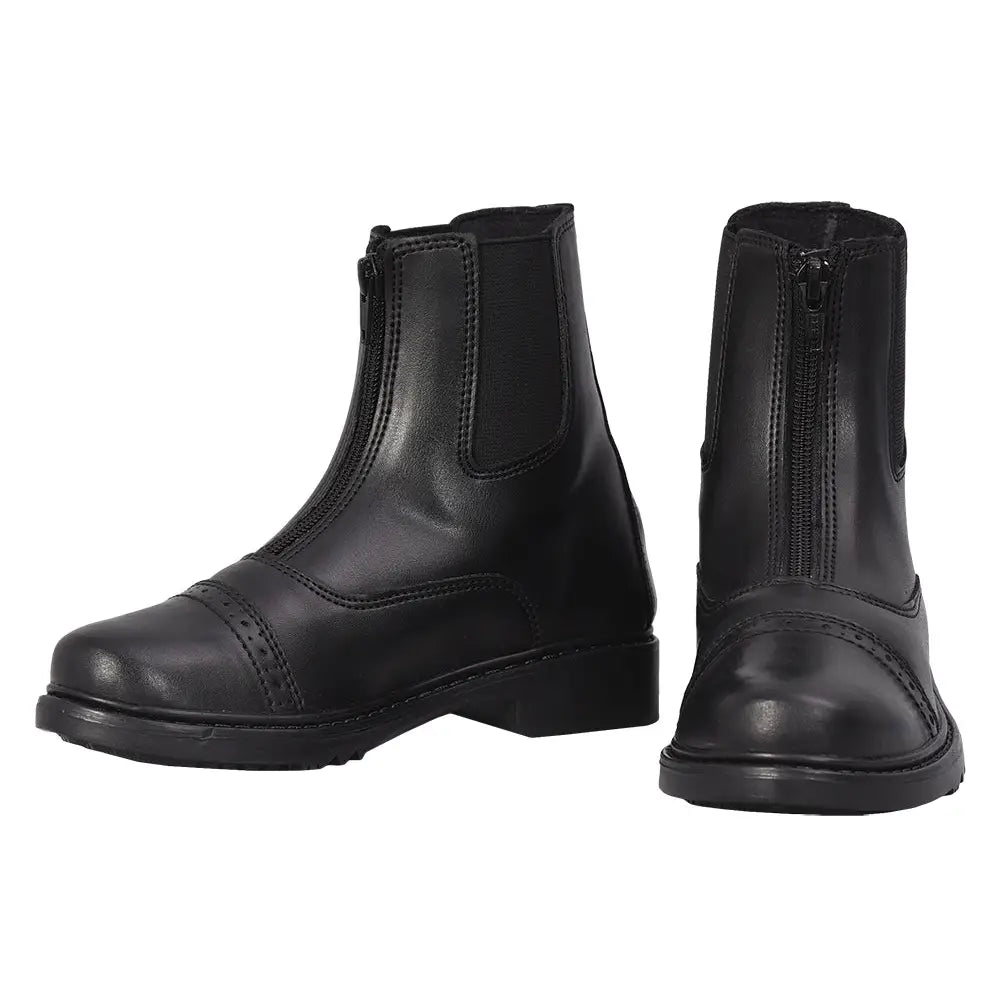 These paddock boots from TuffRider have a timeless and stylish silhouette, making them the perfect footwear for your kid’s riding sessions. The single-welt construction with synthetic leather material helps make them rugged and durable for prolonged usage. The punched toe cap and topstitch detailing complement their overall classic look. Crafted to be stylish and functional even for everyday usage. The water-resistant design helps reduce the chances of water seeping and delivers a dry in-shoe feel even in damp conditions. Features a diamond tread pattern at the outsole to help deliver enhanced traction and stable foothold on various turfs. Pair them with our best-selling riding tights* and show coats* for a fashionable appearance.
