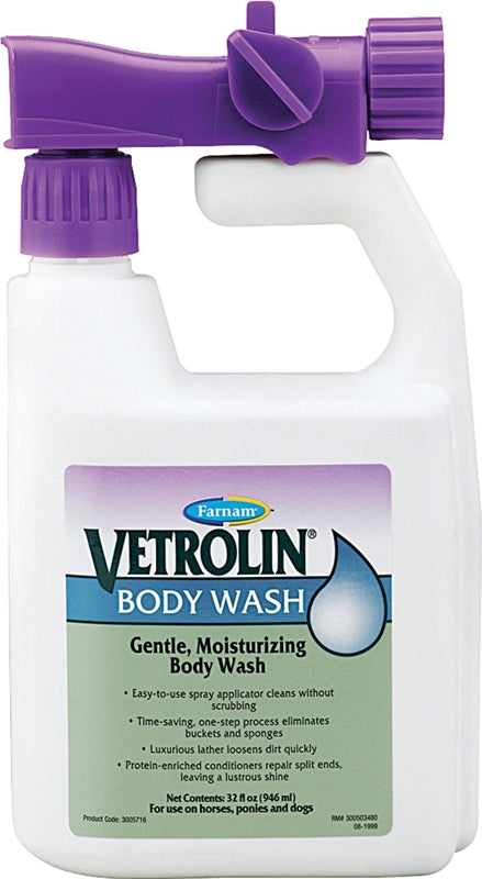 Specially formulated surfactants produce a rich lather to gently lift away dirt, skin debris and dandruff. Protein enriched conditioners repair split ends giving your horse a lustrous shine, while paba sunscreen protects skin. Vetrolin body wash is easy and economical to use. One step applicator releases a measured amount to eliminate product waste. Connect sprayer to garden hose. For use on horses, ponies and dogs. An innovative easy to use spray applicator that cleans without scrubbing. No buckets or sponges needed. Break off locking tab to allow dial to turn. Rotate dial to wash to begin shampooing horse